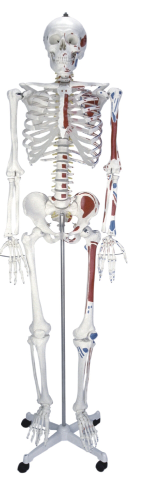 ■ 功能:顯示男性全身骨骼的組成和形態(tài)外觀,其中四肢骨可以靈活組合,頭顱骨和靈活組裝,固定在支架上,帶底座,可靈活移動(dòng)。左半側(cè)骨骼用不同顏色油漆標(biāo)識(shí)出肌肉起止點(diǎn)位置;