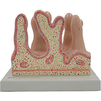 ■ 功能:模型顯示空腸內(nèi)面粘膜表面許多絨毛結(jié)構(gòu),絨毛由粘膜上皮和固有層向腸腔突起而成;
