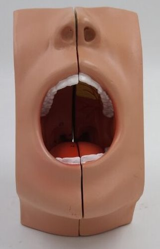 ■ 功能:模型至頸上部在舌骨高度作水平切。主要顯示口腔,消化管的起始部??谇坏那氨诤蛡?cè)壁由上、下唇和頰組成,經(jīng)口裂與外界相通,口腔借牙弓(牙槽突、牙齦、牙列)分成前后二部,前外側(cè)部顯示口腔前庭,后內(nèi)側(cè)部顯示固有口腔,其前界及外側(cè)界為牙弓,向后借口咽峽與咽交通,其上壁的前部為硬腭,后部為軟腭。模型還顯示上、下恒牙的牙冠、扁桃體上隱窩、口咽峽、舌扁桃體、舌體、咽腭弓、腭扁桃體、舌腭弓、腭垂、腭大動(dòng)脈、腭舌肌及口唇等;