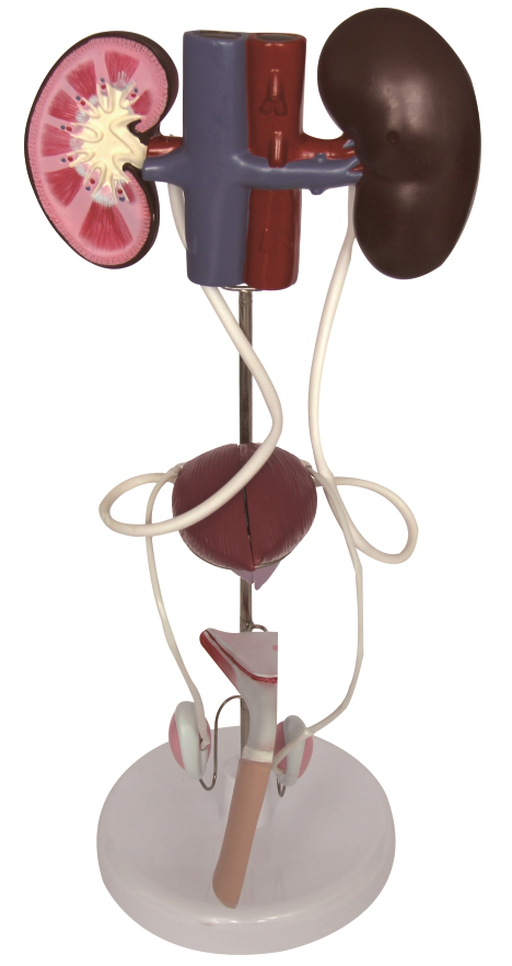 ■ 功能:顯示了腎、輸尿管、膀胱、尿道、睪丸、附睪、輸精管、射精管、前列腺、精囊腺及尿道球腺等,一側腎作額狀切面,示其皮質、髓質、腎小盞、腎大盞和腎盞等。膀胱、前列腺、陰莖作矢狀剖面,膀胱內腔示膀胱三角、尿道內口、輸尿管開口。前列腺示外形及剖 面。陰莖示陰莖海綿體和尿道海綿體。睪丸作正中矢狀面,示睪丸小葉及睪丸網等;