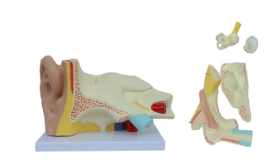 ■ 功能:模型顯示外耳、中耳和內(nèi)耳。帶錘骨、砧骨和鐙骨的鼓膜是可拆卸的。其他可移動部分包括:耳蝸和迷路,前庭神經(jīng)和耳蝸神經(jīng),2個定義中耳和內(nèi)耳的骨段;