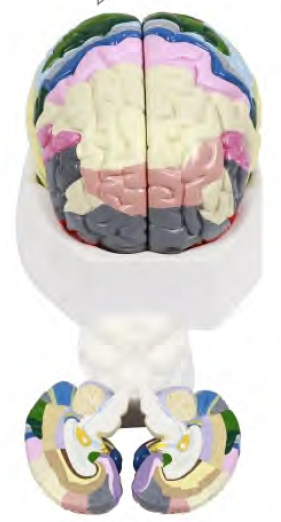 ■ 功能:大腦作正中矢狀切面,左側(cè)大腦半球作水平切面,并剖開顳葉, 顯示間腦;小腦作矢狀剖面;按照醫(yī)學本科統(tǒng)編教材設計,按不同功能部位進行定位,并用顏色加以區(qū)別;