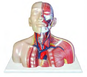 ■ 功能:模型經(jīng)第4一5胸椎高度橫切,右側(cè)及后側(cè)保留皮膚,左側(cè)作 層次解剖,并切開胸骨,暴露心臟;顯示上腔靜脈在頭頸部的各級屬支,胸腔上部解剖至上腔靜脈;