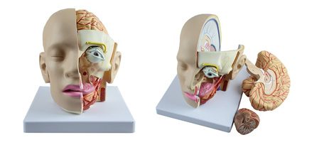 ■ 功能:模型由4部分組成,分別為:半腦,特征是大腦的內(nèi)部結(jié)構(gòu),包括血管;半小腦;眼睛與視神經(jīng)神經(jīng)。神經(jīng)右側(cè)面部的矢狀面和水平面解剖,顯示了頭骨和大腦的許多重要內(nèi)部特征,以及整個(gè)口腔鼻腔;