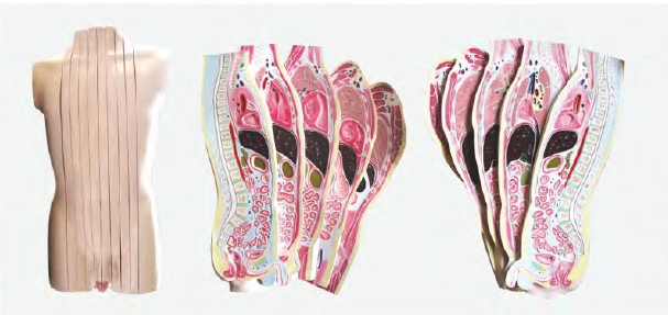 ■ 功能:顯示人體男性矢狀斷面解剖模型結(jié)構(gòu)和形態(tài),將人體從頸根部到盆部整個軀干分解成10片典型部分的結(jié)構(gòu),自正中矢狀斷向左右各分切5片,計10片;