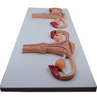 ■ 功能:模型由女性生生殖器官冠狀切面(一個切面有精子進入,另一個切面有卵子受精后胚泡植入了宮內(nèi)膜)的兩個部分組成,并顯示精子進入女性生殖器官,卵子與精子相遇受精后胚泡植入子宮內(nèi)膜等結(jié)構(gòu);