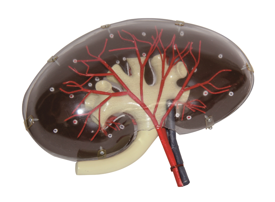 ■ 功能:模型用透明有機(jī)玻璃外殼顯示腎外形特征,腎內(nèi)部的腎實(shí)質(zhì)額狀切面示皮質(zhì)、髓質(zhì)及腎乳頭與腎小盞關(guān)系、腎竇部的腎小盞,腎大盞及腎盂,腎動(dòng)脈前后兩支在腎實(shí)質(zhì)內(nèi)腎段動(dòng)脈分布特征,腎蒂主要結(jié)構(gòu)腎動(dòng)脈、腎靜脈、輸尿管的排列關(guān)系;