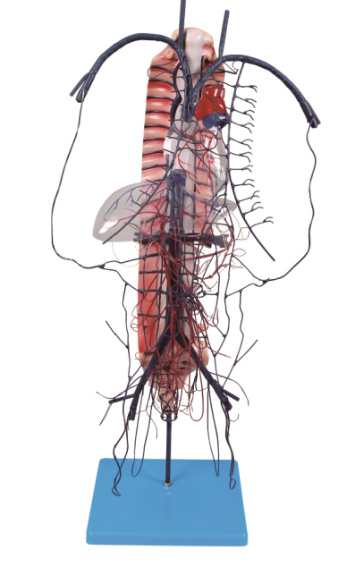 ■ 功能:顯示門靜脈的合成,屬支及門靜脈吻合情況,模型上可見到門靜脈是由腸系膜上靜脈和脾靜脈合成,經(jīng)肝門入肝, 在肝內(nèi)反復(fù)分支成毛細(xì)血管,然后再匯集成三支肝靜脈經(jīng)第二肝門出肝,在腔靜脈窩內(nèi)注入下腔靜脈。模型上的門靜脈屬支尚有胃冠狀靜脈、胃右靜脈、附臍靜脈以及注入脾靜脈的腸系膜下靜脈等。此外,在盆腔內(nèi)可見到直腸靜脈叢及直腸上、下靜脈;在胸腔內(nèi)可見食管靜脈叢及奇靜脈和半奇靜脈;在胸腹壁上可見到臍旁靜脈叢及胸腹壁上、下靜脈、腹壁淺靜脈和胸腹壁靜脈;