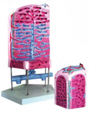 ■ 功能:模型是將人肝的一個肝小葉放大,屬五角棱柱形,在肝小葉周邊可見到小葉間結(jié)蒂組織,內(nèi)有小葉間動靜脈、膽管及淋巴管,并可看到小葉表面的肝板及血竇。并可將模型解剖開,顯示其內(nèi)部的中心靜脈、肝血竇、肝板、每個肝細(xì)胞的立體外形、肝細(xì)胞表面的毛細(xì)膽管及肝血竇中枯否化細(xì)胞。模型上附有二塊特殊部分,一個是透明部分,可透視出肝血竇,以及環(huán)繞每個肝細(xì)胞的六角形毛細(xì)膽管立體網(wǎng),用于顯示肝細(xì)胞,肝血竇及毛細(xì)膽管三者間的復(fù)雜關(guān)系。另一個是顯示肝小葉外面到中間部的肝小葉部分結(jié)構(gòu),其中肝血竇大部為橫斷,其間的肝細(xì)胞基本上為一層。在本肝小葉模型下面附有小葉下靜脈;