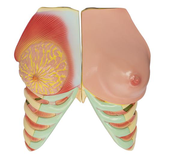 ■ 功能:顯示成年女子未授過乳的乳房,左側(cè)示乳房的外形,中心為乳頭,周圍為乳暈及其乳暈腺,右側(cè)示解剖面乳房的構(gòu)造、乳腺、乳房小葉、輸乳管、輸乳管竇、輸乳孔以及乳房脂肪、胸骨等內(nèi)外面結(jié)構(gòu);