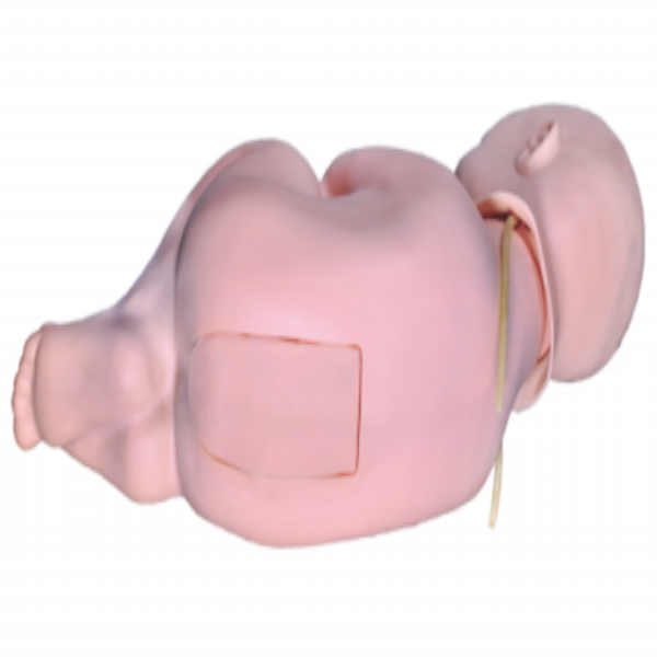 ■ 仿照嬰兒真人大小,側(cè)臥于硬板床上,頭向胸前彎曲,雙膝向腹部彎曲,雙手抱膝,腰背尺量向后弓起,也可模擬坐位;嬰兒完整頭頸部,并有完整的嬰兒左右側(cè)兩面,額部分布主要血管系統(tǒng)